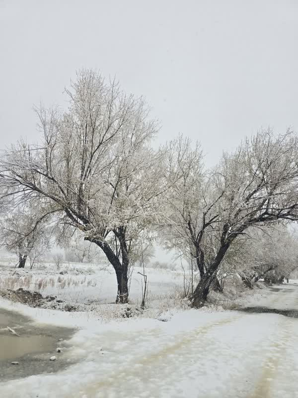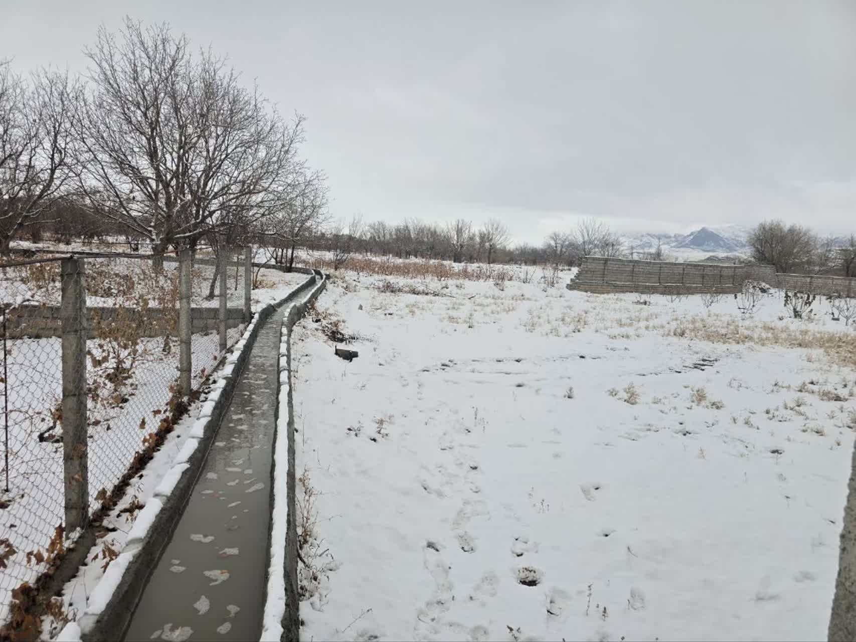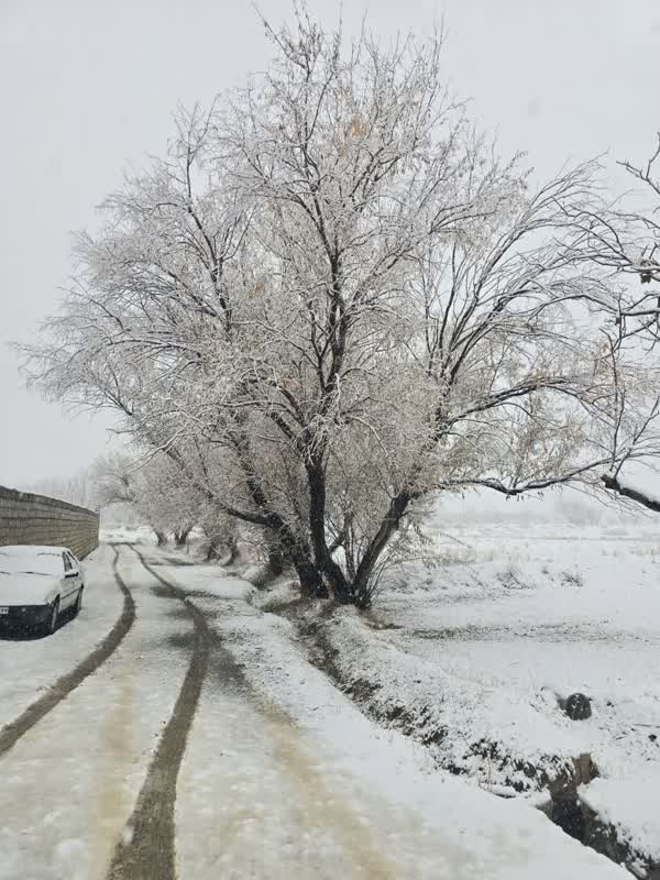 در تصویری دیگر، درختانِ کهنسالِ حاشیهی مزارع، با شاخههایی که اکنون به کریستالهای یخی بدل شدهاند، شکوهِ زمستانی را به رخ میکشند و آنسو تر، جویِ سیمانیِ آب، همچون شریانِ حیاتیِ روستا، آبِ زلال را از میانِ دشتِ سفیدپوش عبور میدهد تا بگوید: «حتی در سردترین روزها، جریانِ خدمت و برکت متوقف نمیشود.»