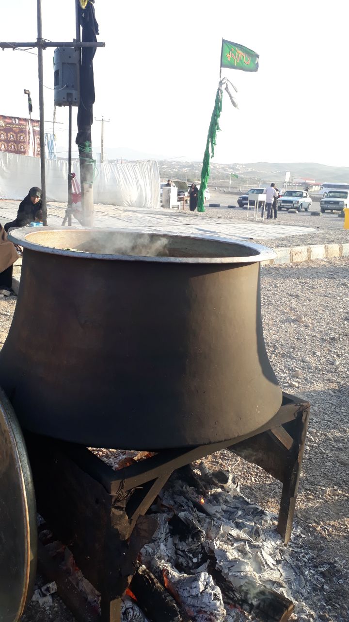 • پخت آش نذری در دیگ‌های بزرگ و سنتی که در تصویر نیز نمایان است، یکی از اصلی‌ترین محورهای این خدمت‌رسانی محسوب می‌شود. استفاده از آتش هیزمی و قرارگیری دیگ بر روی سازه‌های فلزی ساده و محکم، روایتی از تداوم شیوه‌های دیرین پخت نذری در مناطق روستایی استان اصفهان است؛ شیوه‌ای که نه تنها به لحاظ طعم و کیفیت غذا، بلکه از نظر پیوند عاطفی اهالی با سنت‌های مذهبی، اهمیت ویژه‌ای دارد. ترکیب بوی آتش، هوای خنک مهرماه و فضای باز حاشیه‌ی کویر مرکزی، حال‌وهوای خاصی ایجاد می‌کند که برای زائران خسته از مسیر طولانی، دلپذیر و آرام‌بخش است.